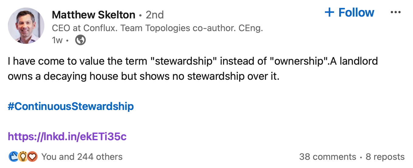 "I have come to value the term "stewardship" instead of "ownership".A landlord owns a decaying house but shows no stewardship over it."