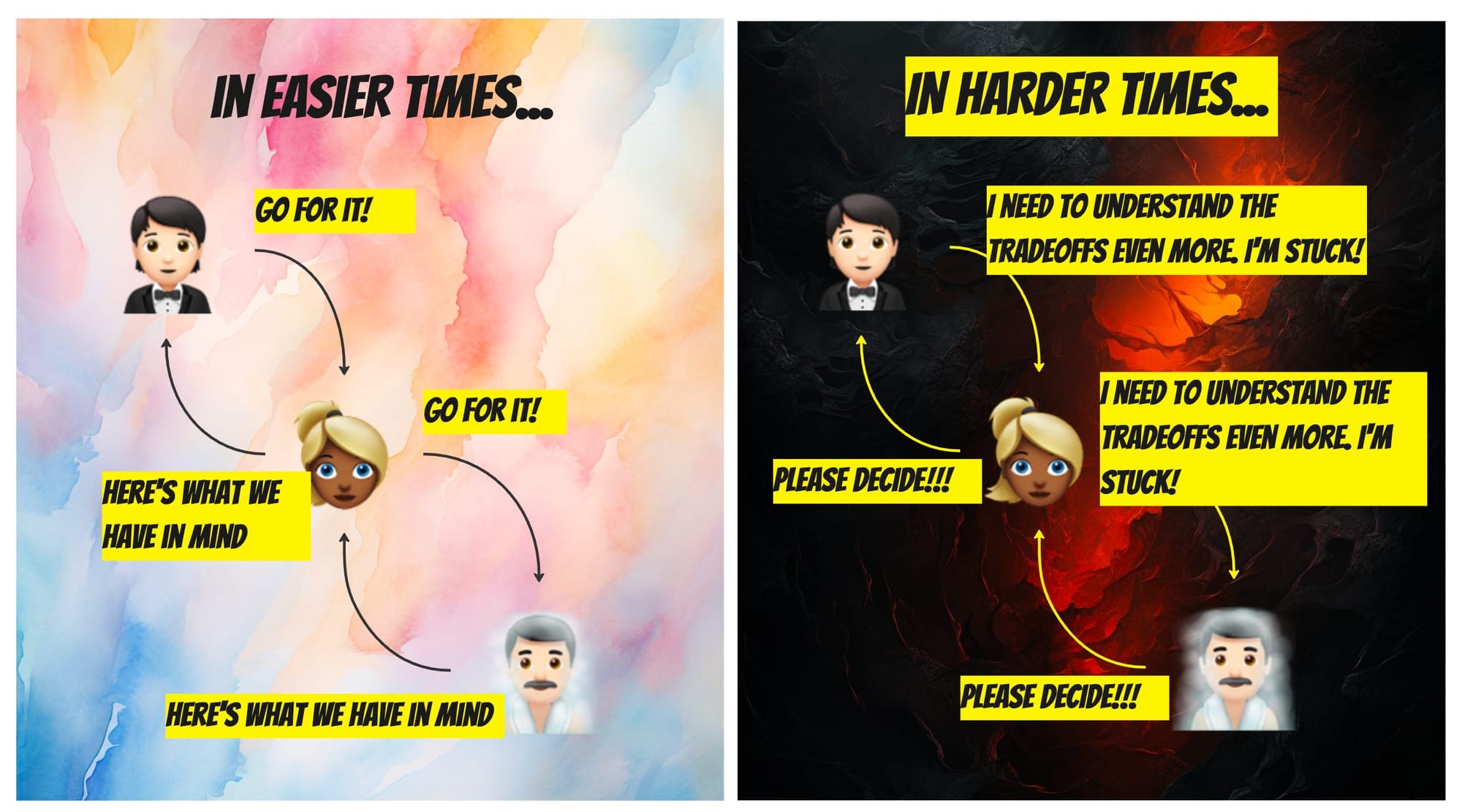 It isn't about "flattening" the org chart but rather about ensuring people who can discuss reality are in the room. In short, the current emphasis on "going deep" and "getting into the details" is a reaction to an overreaction and overstretching of the org chart. So, it is time for a reset without over-reacting again. Yes, spend time to understand what is happening and be a better advocate during more challenging times. No, don’t heap on even more asks for detailed trade-offs and detailed plans, so you can play defense.