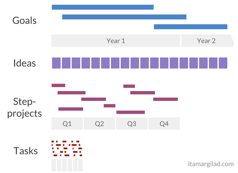 The GIST framework by Itamar Gilad is a compelling alternative. GIST stands for Goals, Ideas, Step-projects, and Tasks. These represent the various levels of building blocks used in the roadmap.